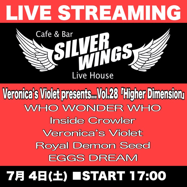【必ずお読みください!】 ※ご購入期限は7月4日ライブ終了までです。 以下の有料配信ライブの配信URL付チケットです。 ご購入頂きましたお客様に配信URLを記載したpdfファイルをお届け致します。 返信メールのURLよりpdfファイルをダウンロードして下さい。 ※ダウンロードされたpdfファイルを開くと当ライブの配信URL及びQRコードが表示されます。 ★★重要★★ 『ダウンロードは期限内』に行って頂き、『ファイルを必ず保存』してください。 【配信における免責事項】 配信中における、不可抗力による回線中断・通信障害が起こりました場合は確認でき次第速やかに善処対応致しますが、障害が発生していた間の映像音声の補償は出来かねる事、また明らかなこちらの人為的ミス(配信ボタンの押し忘れ、配信URLの間違い、機材やPCの設定ミス等)による不具合を除いて、基本的にご返金はできませんので何卒ご了承ください。 ■2026/7/4(土) Veronica's Violet presents...Vol.28 「Higher Dimension」 ■出演 Fermented Cats(カルメン・マキ&OZトリビュート) WHO WONDER WHO Veronica’s Violet Royal Demon Seed EGGS DREAM(EXTREMEトリビュート) ■START 17:00